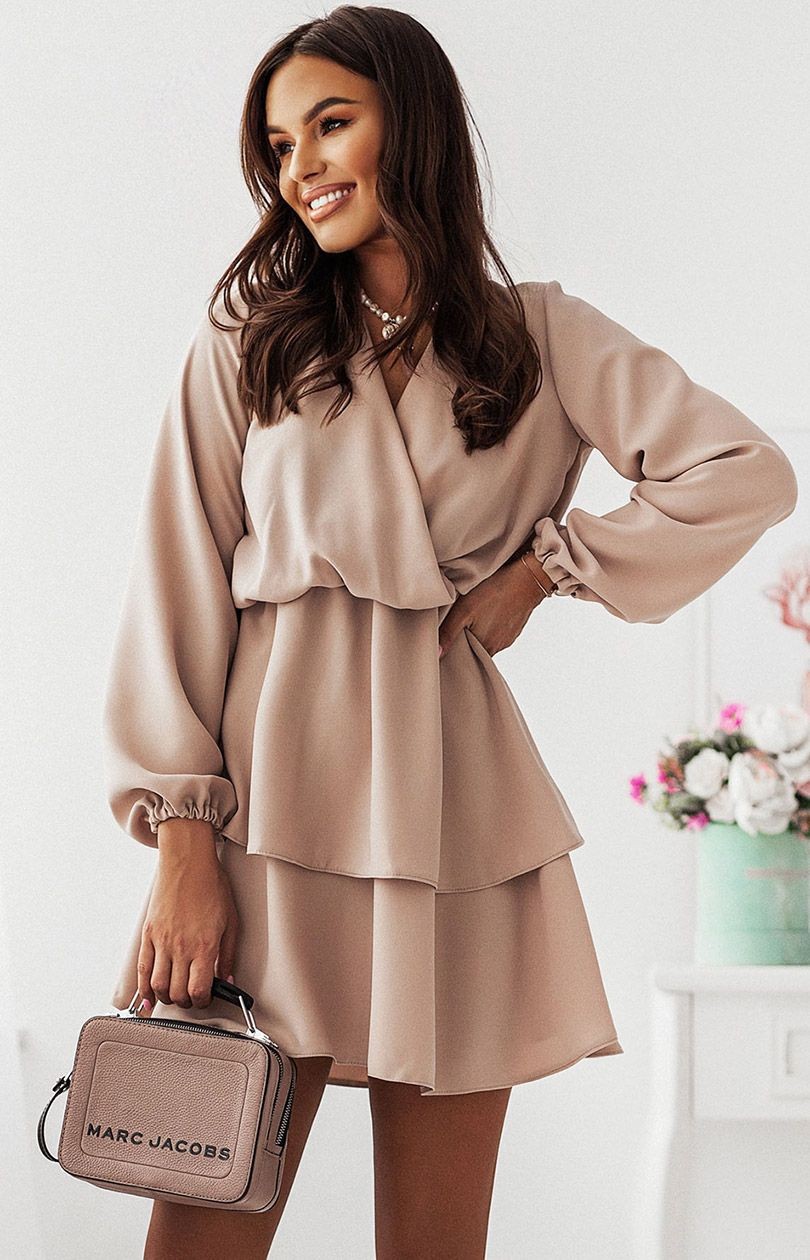 Beżowa sukienka MADELLAY z tyłu wycięcie w kształcie litery V i wiązanie