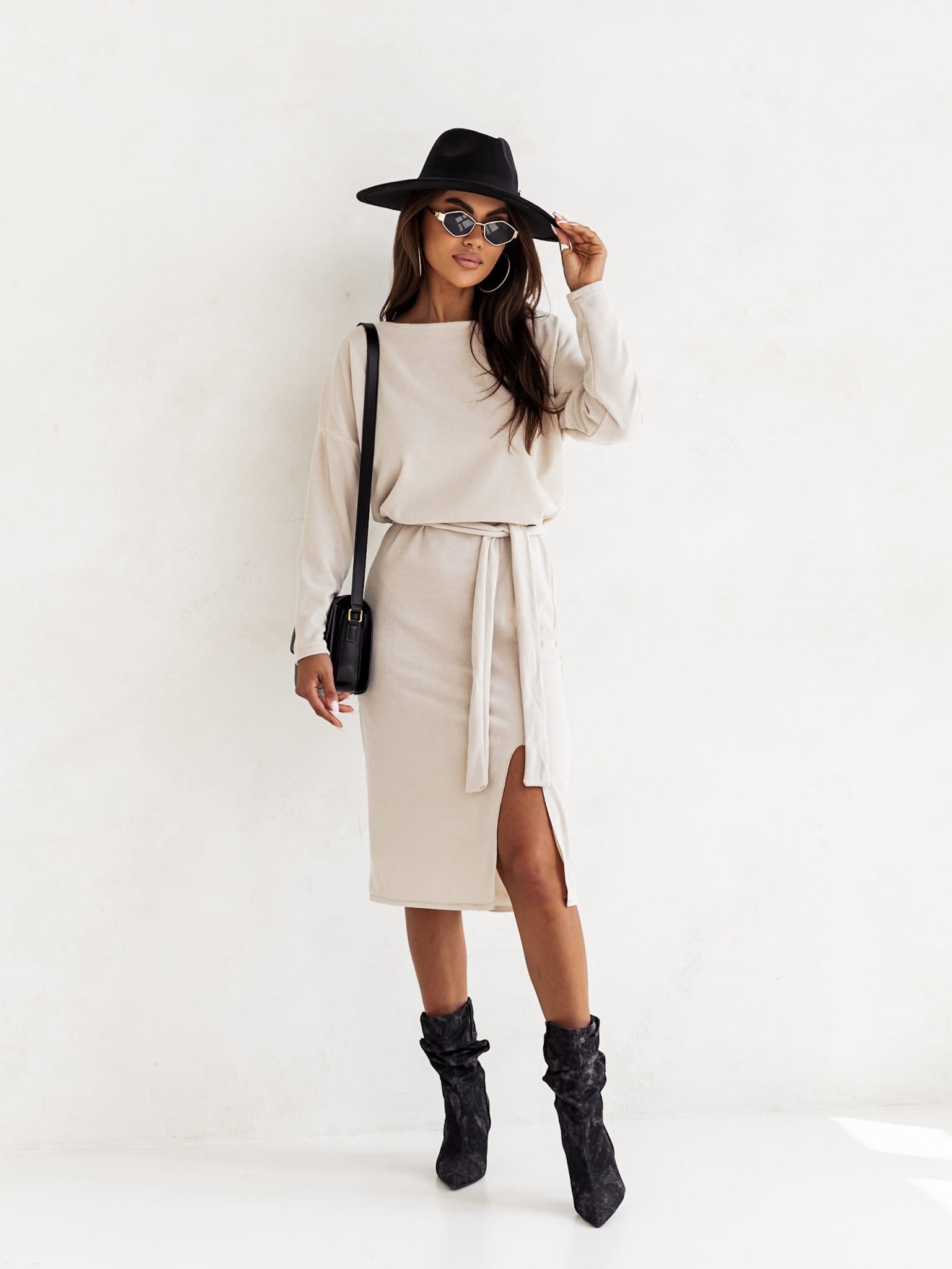 Dzięki przemyślanemu krojowi i rozcięciu z przodu, sukienka pięknie układa się w ruchu, gwarantując wygodę na co dzień i podczas wyjątkowych okazji. Można ją łączyć z różnymi elementami garderoby — świetnie wygląda zarówno z elegancką marynarką, casualową jeansową kurtką, rockową ramoneską, jak i klasycznym płaszczem.