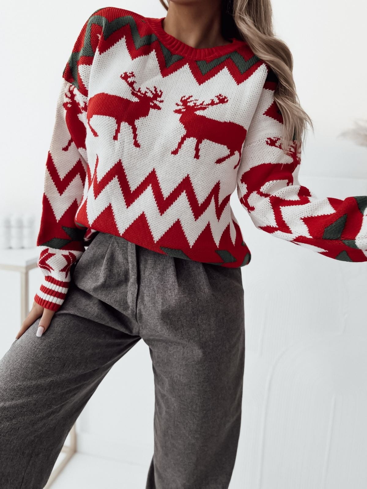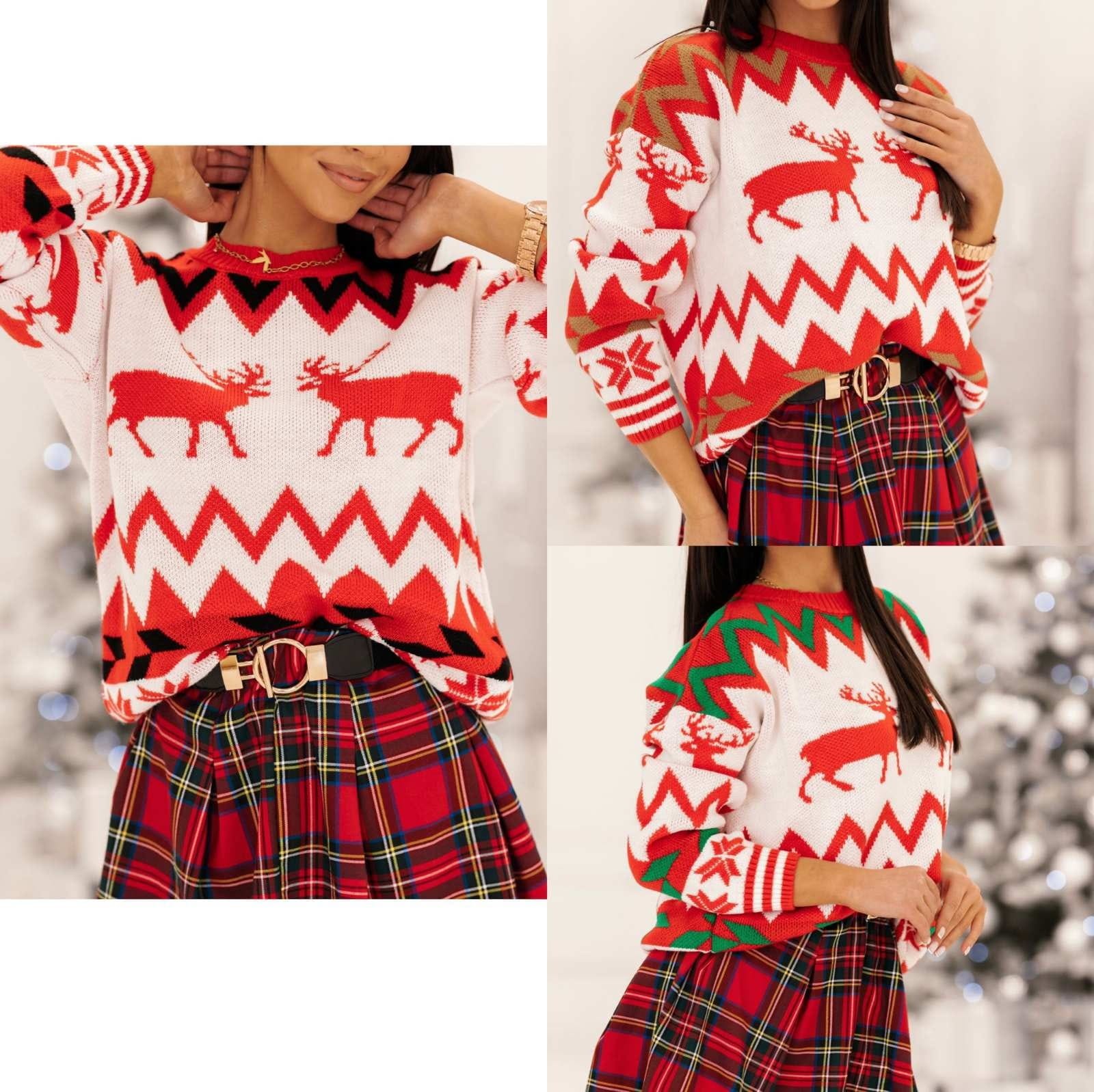 Świąteczny Sweter Ciepły, Uniwersalny Rozmiar, Zimowy Wzór łączy zmysłową estetykę i codzienny komfort. Elastyczne, miękkie materiały układają się jak druga skóra, a krój akcentuje talię, biust i biodra.