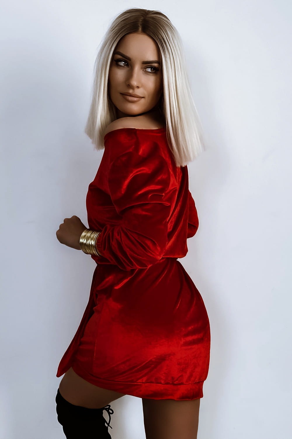 W luźnym kroju sukienka typu kimono, wiązanie podkreśla talię w kolorze czerwonym